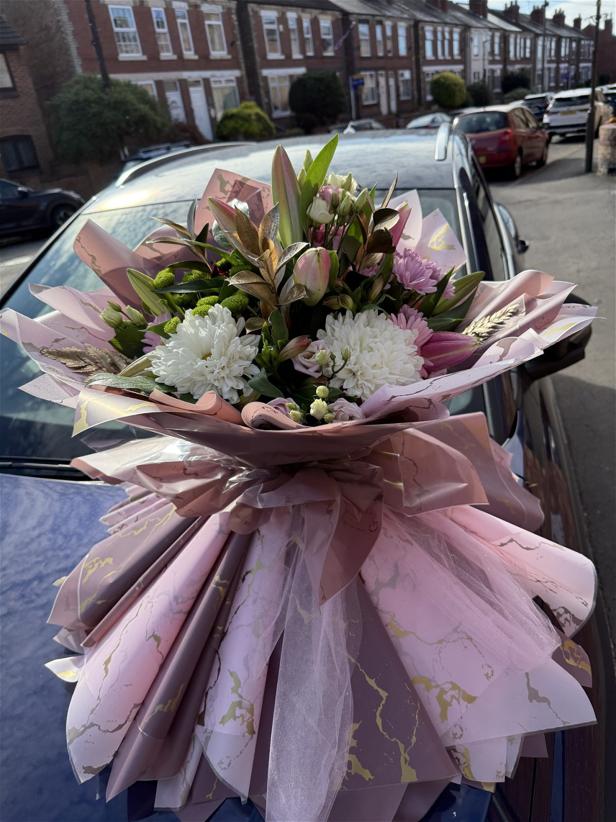 A large spectacular frilly wrap bouquet is all about drama, abundance, and presentation. It’s the kind of bouquet designed to make a wow statement—luxurious, oversized, and styled with plenty of soft textures and layers.
